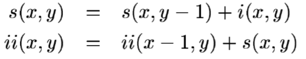 수식을 설명하자면, 그림 2에서 s(x,y)는 누적된 행의 값, i(x,y)는 원본, ii(x,y)는 integral image이다.