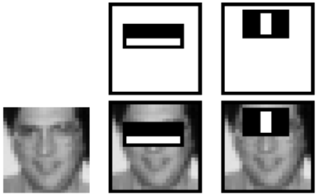 첫 번째 feature는 눈 영역과 광대 윗 부분 영역의 밝기 차이를 측정한 것이다. 첫 번째 결과는 눈 부위가 광대 윗부분보다 어둡다는 특징을 이용해 feature로 나온 것이다.