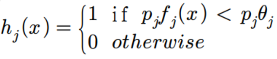 수식에서 h(x)는 weak classifier, f는 h(x)를 구성하는 feature, θ는 threshold, p는 parity(부등호 기호 방향을 나타냄)를 나타낸다.